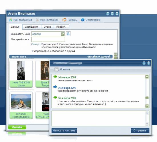 Агент Вконтакте - это программа для моментального получения и отправки сообщений и надписей на стенке Вконтакте, а также просмотр новостей, событий, фотографий ваших друзей. Вы будете всегда в курсе когда зашел или вышел Ваш друг, без задержек. Быстро, удобно и понятно.